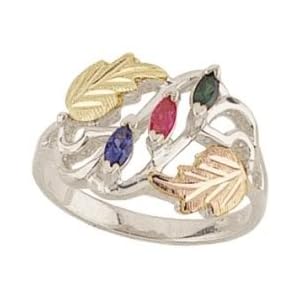 Beautiful! Sterling-Silver & Gold Authentic Black Hills Gold Mothers/Family rings with 2-6 stones.The Metal: Sterling-Silver with 12K red and green Gold leaves. This has been a very popular Family/Mothers rings for many years. The birthstones are 4x2 MM Marquise synthetic stones set in a secure 2-Bezel setting. All stones have a very genuine look to them and is very hard for anyone to be able to tell the difference. 2-6 stones are all the same price. Pick the size from the down chart and then you can email us at richpeel@aol.com as how many stones and the Monthly order that you want them placed or we will call or email you within 24 hours for the stone information. Usually placed from side to side or left to right. 7 to 14 days will be needed for shipping. But we try real hard to get them to you when needed. Manufactures lifetime Warranty