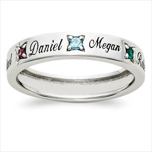 Personalized Valentines Day Gift. The Perfect Gift for Mom Gift Mothers or Grandma with a personalized ring made just for her. Sterling Silver (3.5mm) band is set with the names and birthstones of her loved ones. Choose from 1 to 7 names (8 letters per name) and corresponding Austrian crystal birthstones.